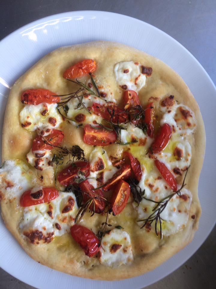 gratinierter französischer Schafskäse auf Tomatenscheiben, mit Knoblauch und pikant